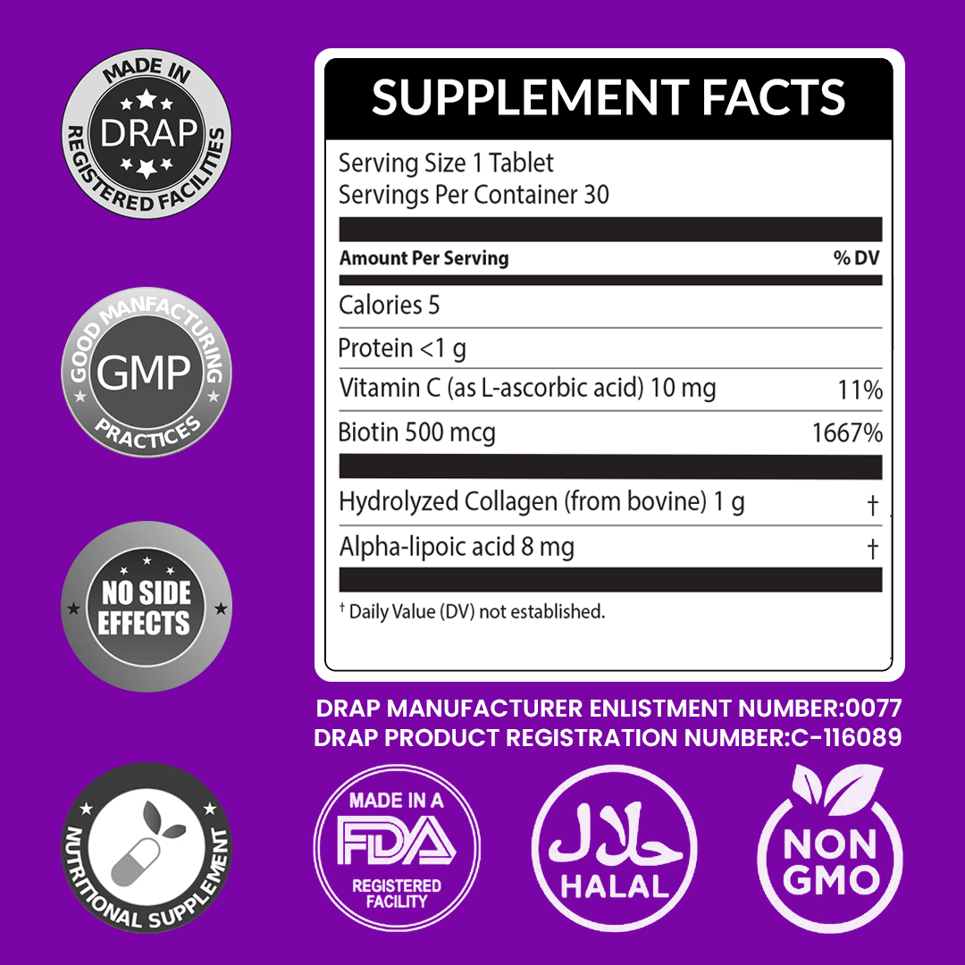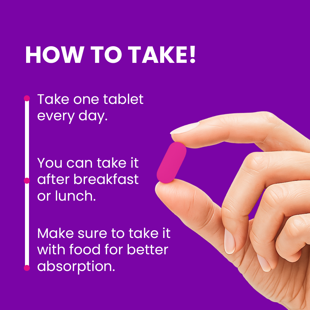 Take one tablet of Collagen+ Biotin daily with water, preferably with a meal for optimal absorption. Consistent daily usage is recommended to achieve the best results. Always consult your healthcare provider before starting any new supplement regimen.