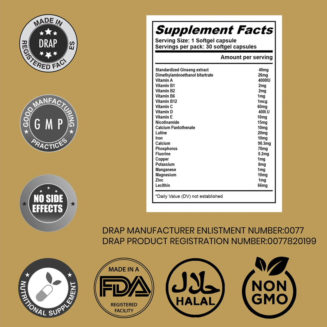 Standardized Ginseng extract, Dimethylaminoethanol bitartrate, Vitamin A, B1, B2, B6, B12, C, D, E, Nicotinamide, Calcium Pantothenate, Lutine, Iron, Calcium, Phosphorus, Fluorine, Copper, Potassium, Manganese, Magnesium, Zinc, Lecithin.