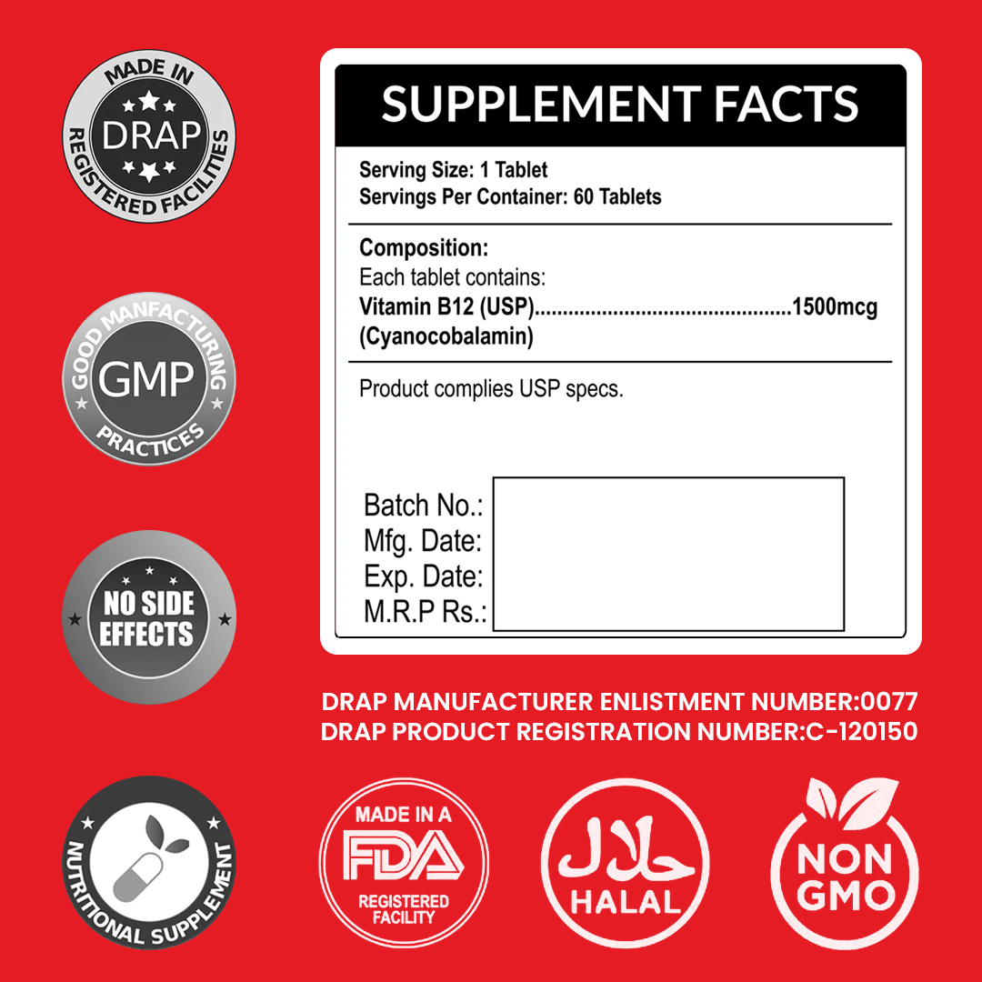 - Vitamin B12 (USP) - 1500 mcg (Cyanocobalamin)